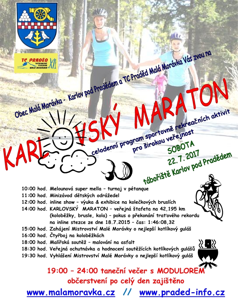 Malá Morávka|18. července 2017 – Obec Malá Morávka společně s TC Praděd připravili na sobotu 22. července celodenní program sportovně rekreačních aktivit pro širokou veřejnost: „Karlovský maraton“ proběhne v areálu tábořiště v Karlově pod Pradědem.