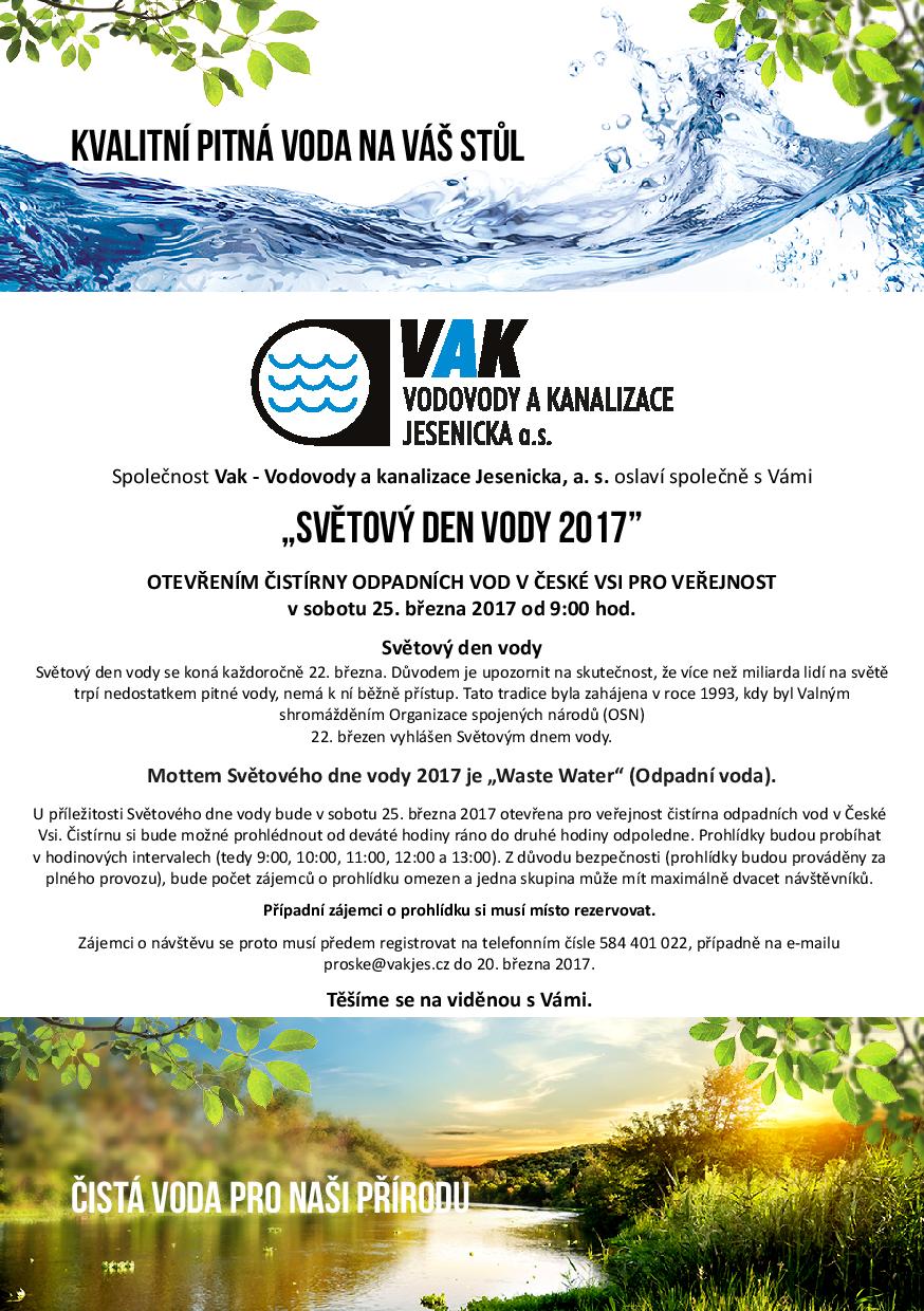 U příležitosti Světového dne vody bude v sobotu 25. března 2017 otevřena pro veřejnost čistírna odpadních vod v České Vsi.