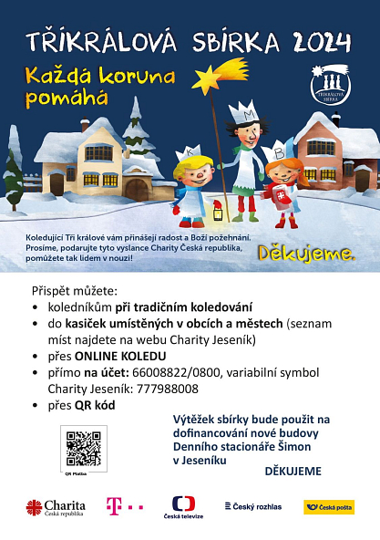Tříkrálová sbírka, při které můžete koledníkům přispět při tradičním koledování do kasiček umístěných ve městě (seznam míst bude zveřejněn na https://jesenik.charita.cz/) nebo i online, potrvá od 1. do 14. ledna 2024.