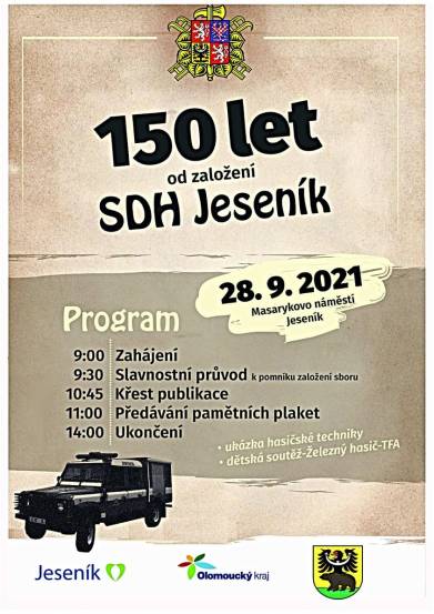 Sbor dobrovolných hasičů Jeseník slaví 150 let od svého založení. Při této příležitosti bude v úterý 28. září na Masarykově náměstí pro veřejnost přichystán malý doprovodný program, ukázka techniky a soutěž pro děti Železný hasič – TFA. Vstuo volný. Akci pořádá SDH Jeseník.