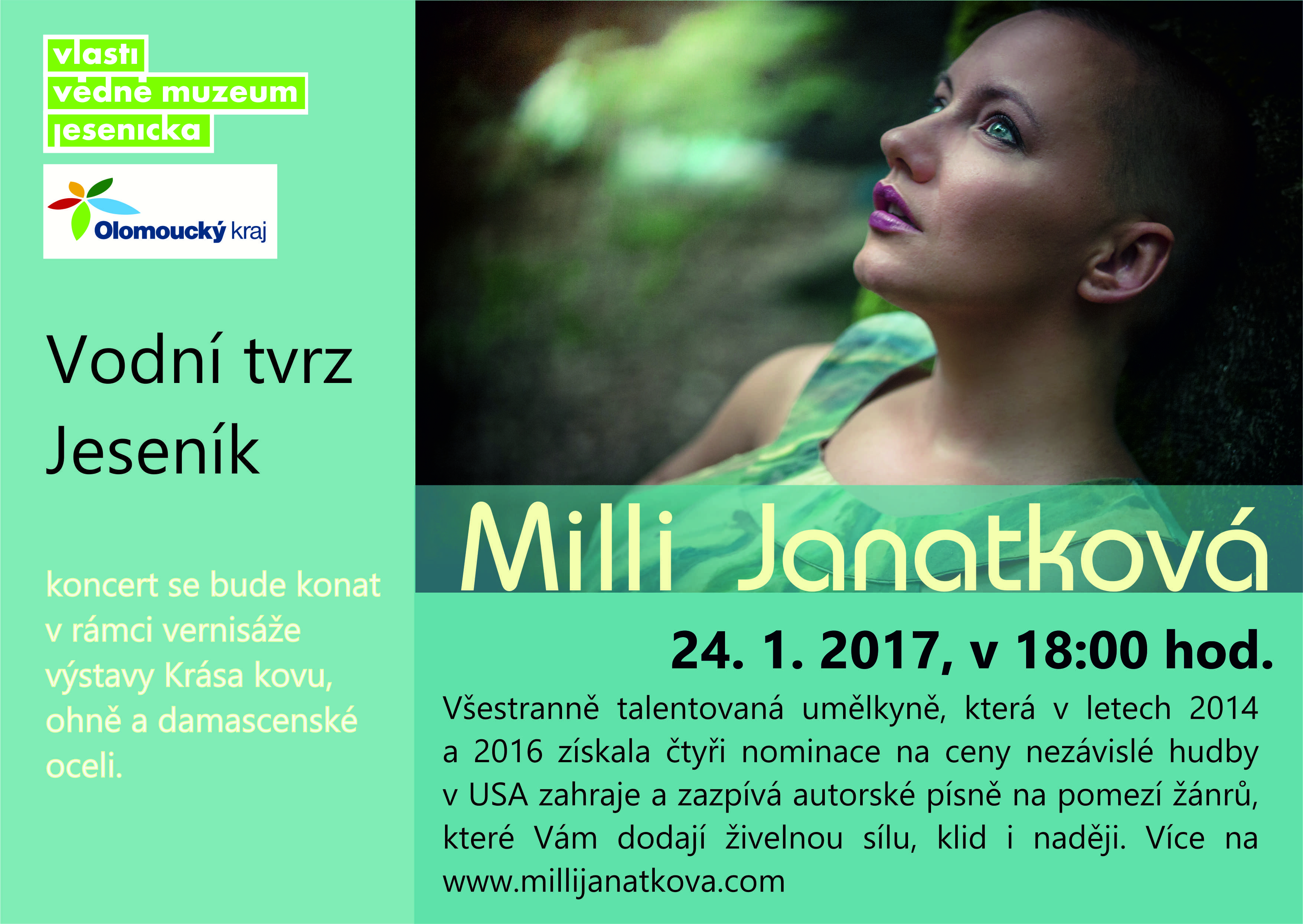 Vernisáž se uskuteční 24. 1. 2017 v 18:00 hodin. V rámci vernisáže se představí všestranně talentovaná umělkyně Milli Janatková, která v letech 2014 a 2016 získala za svou hudbu čtyři nominace na ceny nezávislé hudby v USA. Zahraje a zazpívá autorské písně na pomezí žánrů, které Vám dodají živelnou sílu, klid i naději. Více na www.millijanatkova.com