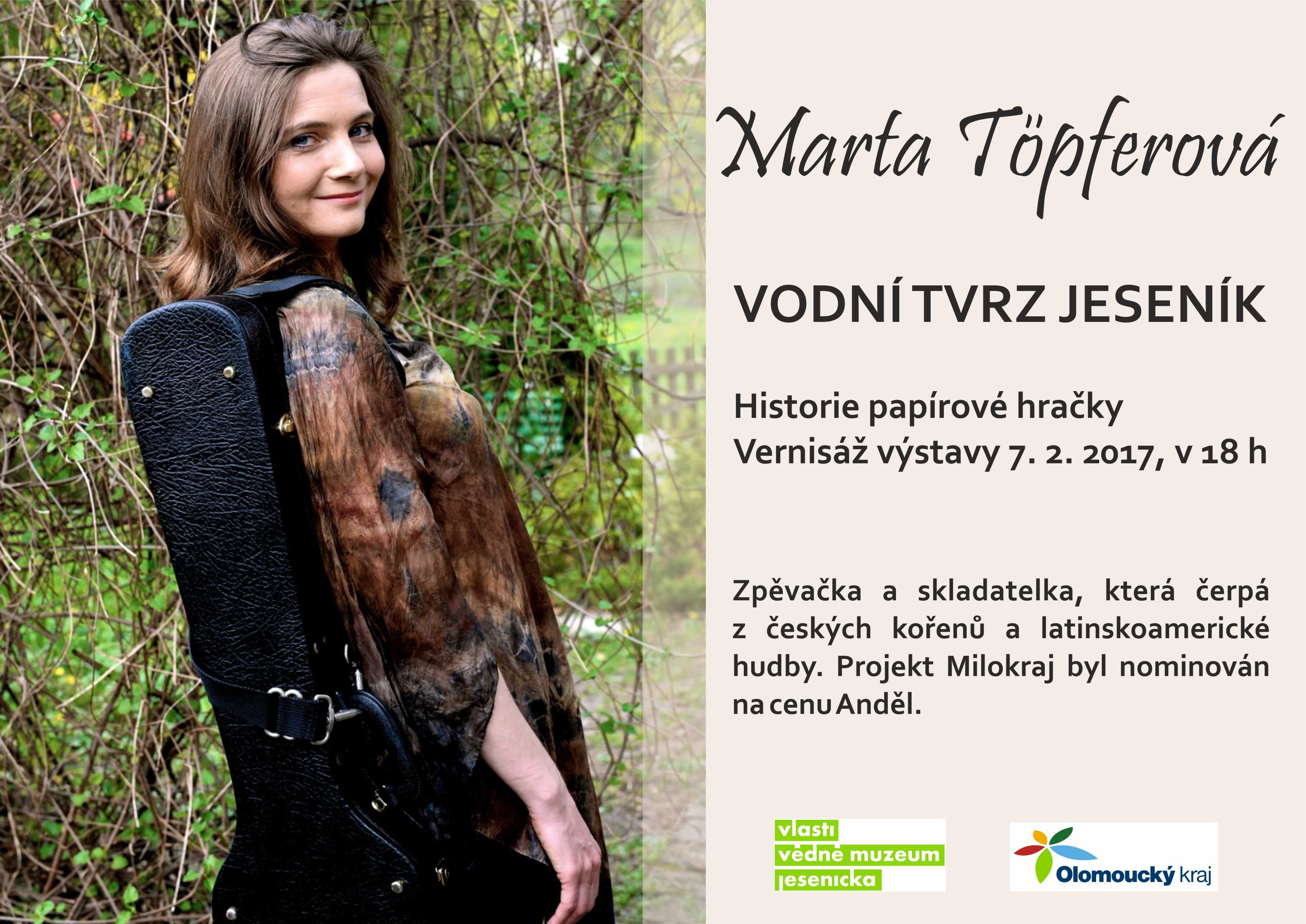 Vernisáž se uskuteční 7. 2. 2017 v 18:00 hodin. V rámci vernisáže se představí umělkyně Marta Töpferová, zpěvačka a skladatelka. Čerpá z českých kořenů a latinskoamerické hudby. Její projekt Milokraj, byl nominován na cenu Anděl. Více na www.martatopferova.com.