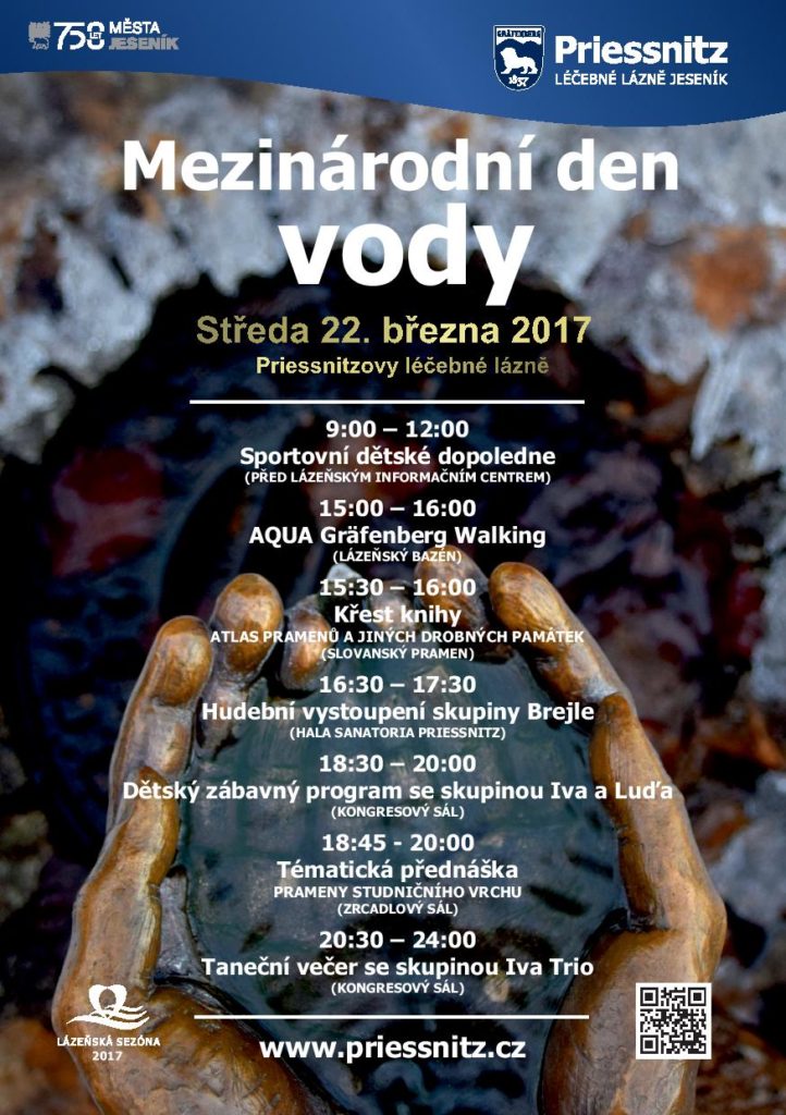 V Jeseníku 15. března 2017 Už od roku 1993 si celý svět připomíná důležitost vody pro život 22. března. V Priessnitzových léčebných lázních si Světový den každoročně připomínají také. Není divu, vždyť jsou považovány za vůbec první vodoléčebný ústav světa. Letos v Jeseníku do celodenního programu patří i křest vskutku jedinečné publikace.