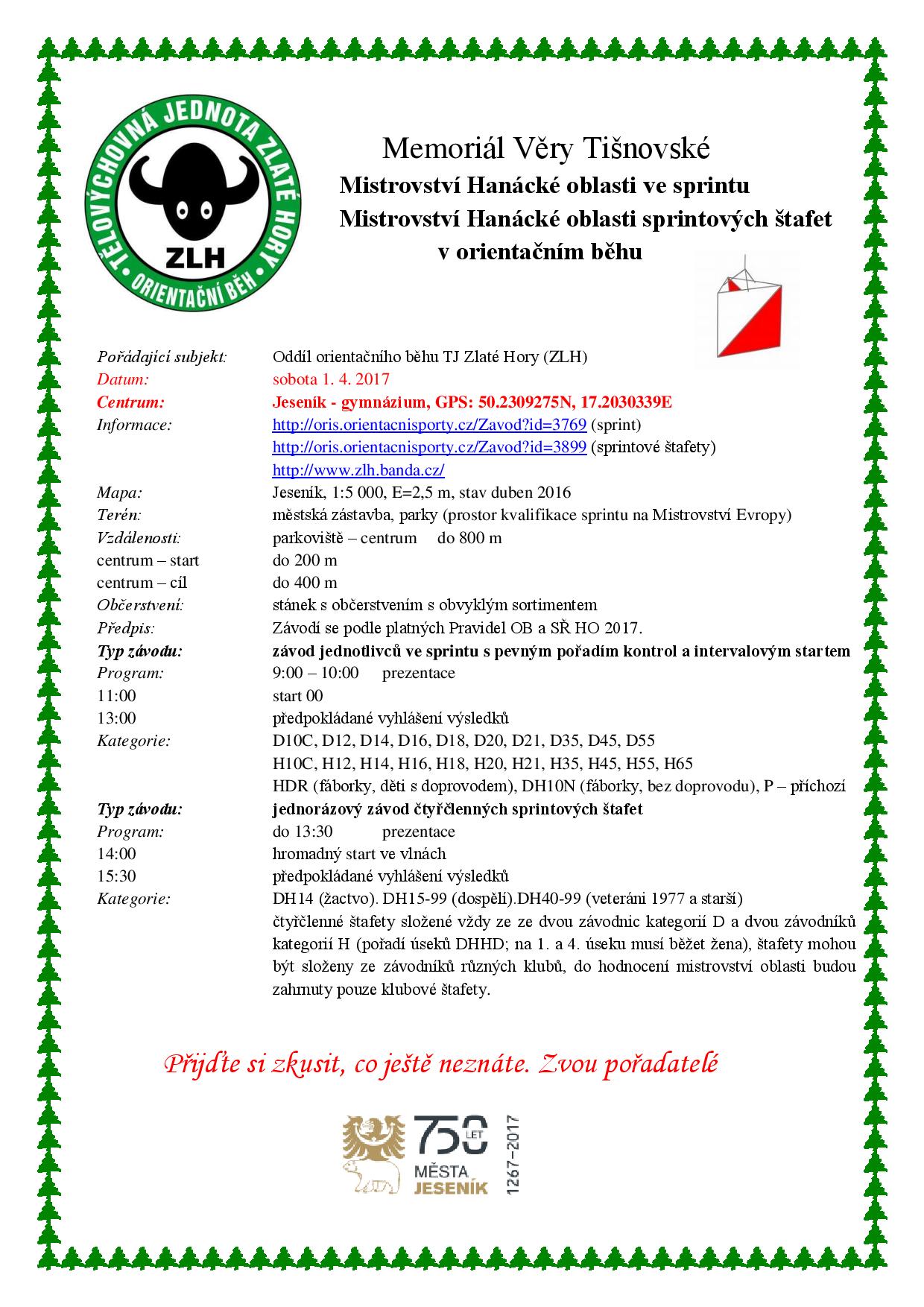 První dubnový den, který připadne na sobotu, bude patřit sportovcům. U jesenického gymnázia si dají sraz orientační běžci, kteří se zúčastní Memoriálu Věry Tišnovské. Do závodu jednotlivců se již přihlásilo více než 300 zájemců a zhruba dvě desítky družstev se zúčastní čtyřčlenných sprintových štafet. Závody jednotlivců začínají v 11 hodin, štafety odstartují ve 14 hodin. Během závodů se s dopravními uzavírkami nepočítá. Akci pořádá oddíl orientačního běhu TJ Zlaté Hory, více o programu na konci článku.