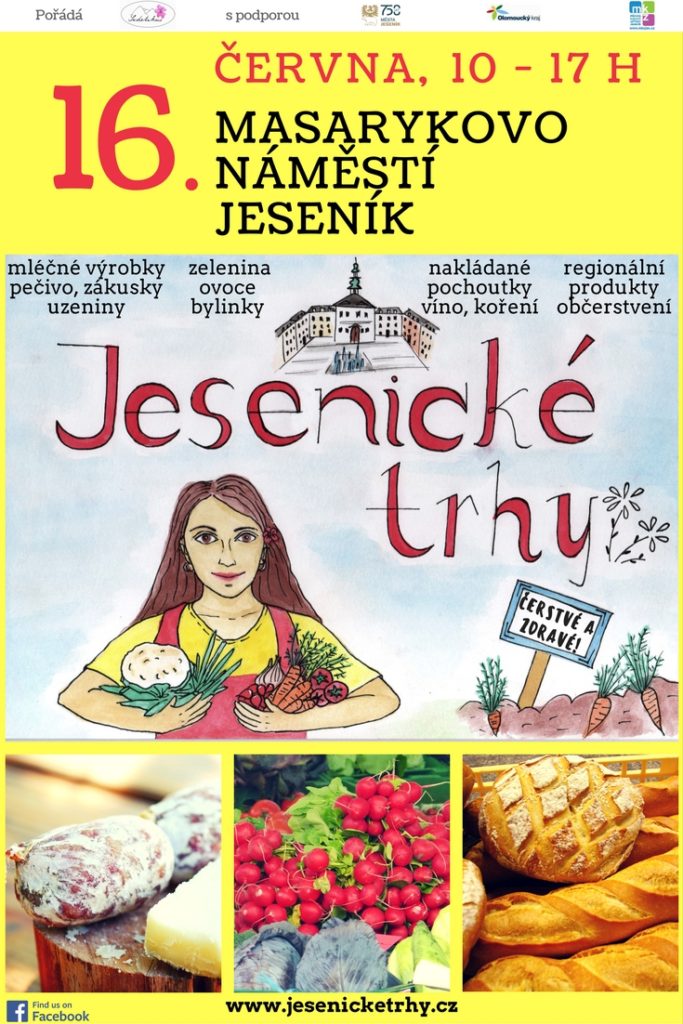 Další ze série oblíbených farmářských trhů v centru Jeseníku se uskuteční tento pátek 16. 6. 2017 mezi 10 a 17hodinou. K mání bude ovoce a zelenina z farem a zahrad, voňavé pečivo a uzeniny a sýry, domácí těstoviny, zeleninové a ovocné bašty, ovocná vína, pečené steaky a klobásky, zákusky, zmrzlina a káva, regionální produkty, drobnosti pro radost.