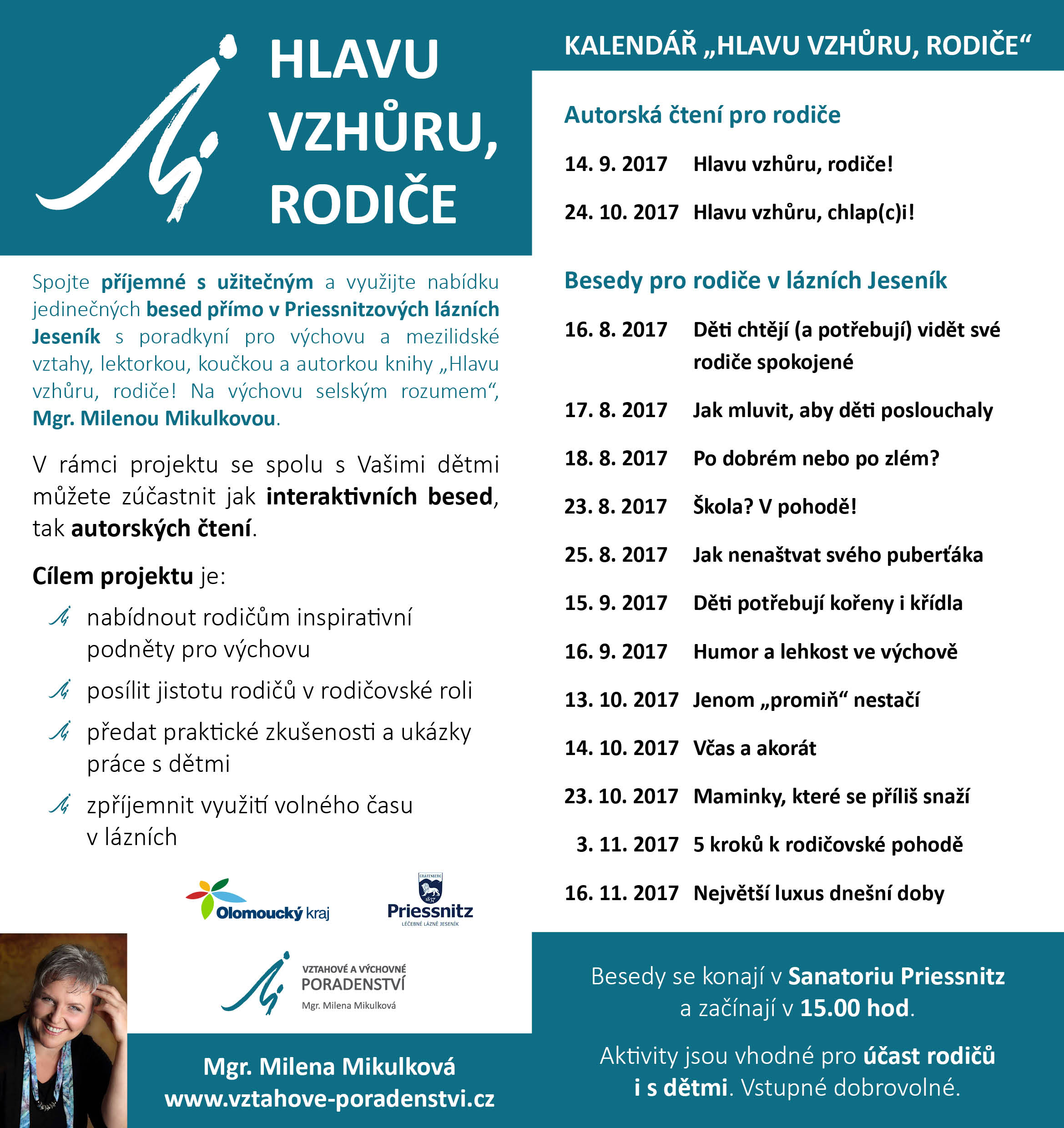 Uvedenou knihu jsem psala tady v Jeseníku, v inspirujících Priessnitzových lázních a tak jsem se rozhodla nabídnout krátká setkávání nad tématy výchovy právě v těchto lázních. Jak pro rodiče dětí – dětských pacientů, tak širokou veřejnost, všem, kterým je téma rodiny, dětí a výchovy blízké. Besed se můžete zúčastnit společně s dětmi.