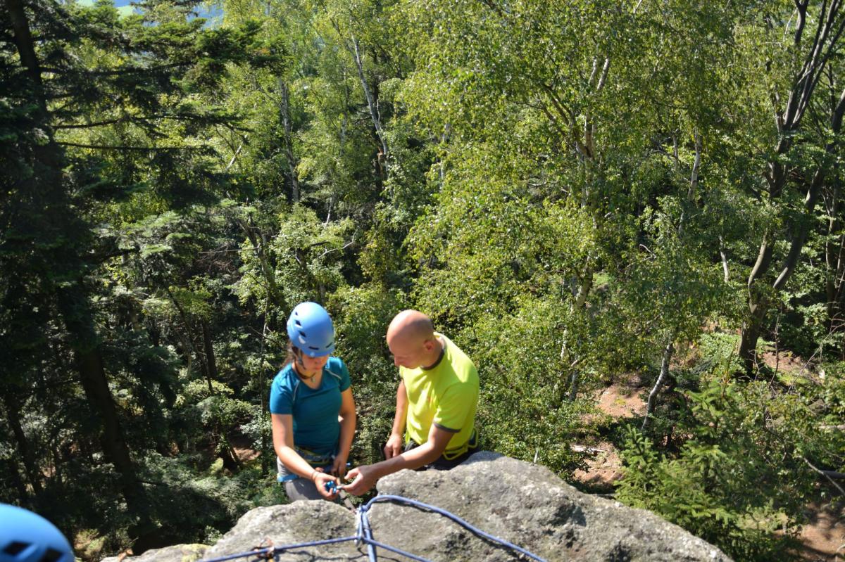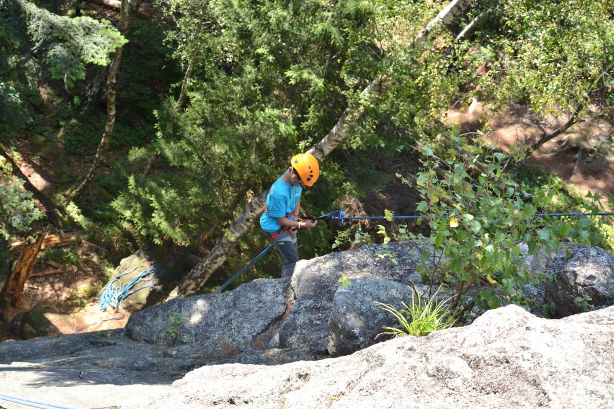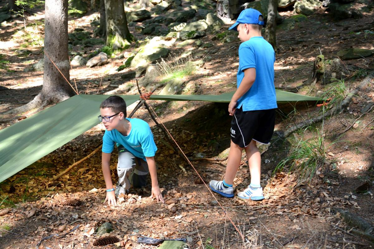 V úterý jsme se opět sešli na autobusovém nádraží a odtud vyrazili směr Čertovy kameny. Během cesty spolu obě družstva bojovala o různé věci potřebné k vyrobení bivaků (nouzových přístřešků), které potom během celého dne ve dvojicích děti budovaly. Kromě toho bylo samozřejmě na programu lezení a slaňování na „Čertovských plotnách“.