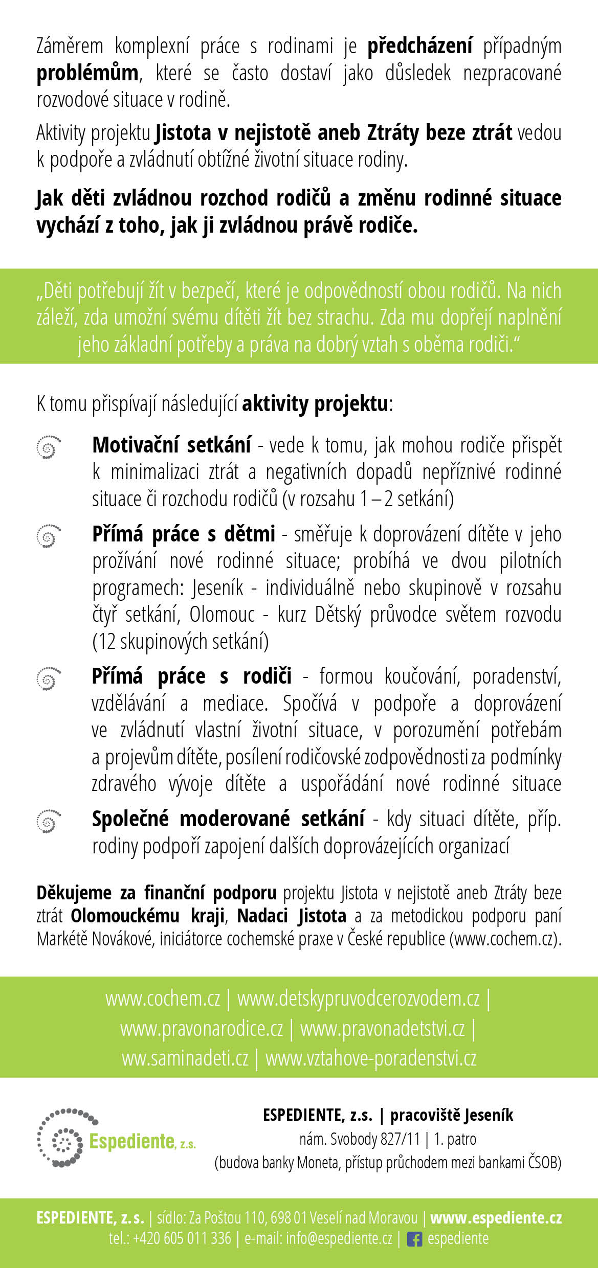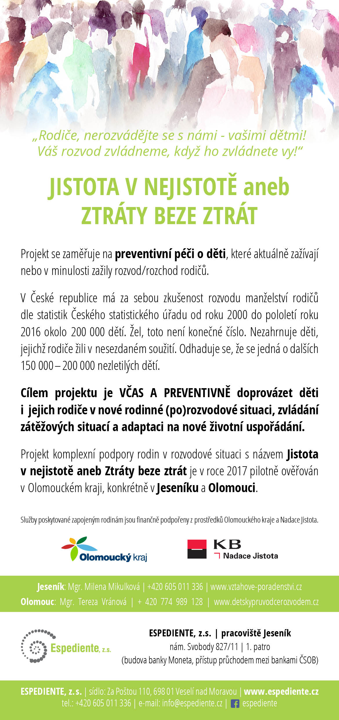 Už jste někdy něco ztratili? Něco důležitého a významného? Jak vám při tom bylo? Možná jste byli smutní, vzteklí nebo i zoufalí. Ano, spoustu z nás zažilo ztrátu. Věcí, zaměstnání, ale i ideálů, naděje či lidí. A právě zvládnutím ztrát, které přináší život v rozvodové a porozvodové situaci se věnujeme v projektu Jistota v nejistotě aneb ztráty beze ztrát. Nabízíme komplexní program podpory, péči o děti i dospělé v pilotním projektu, který podpořil Olomoucký kraj a Nadace Jistota.