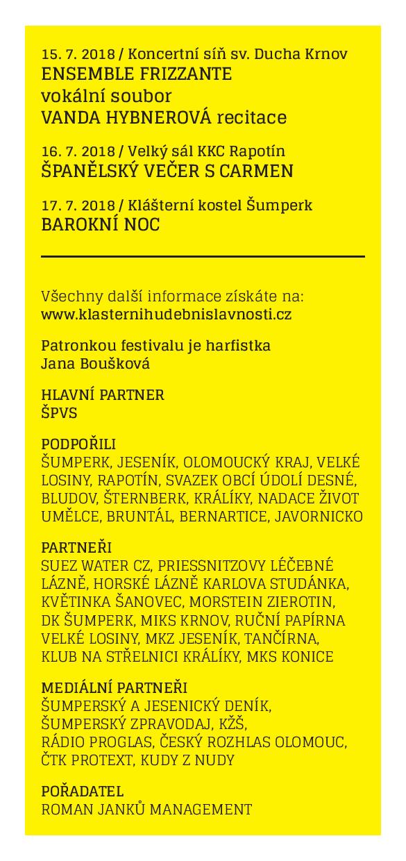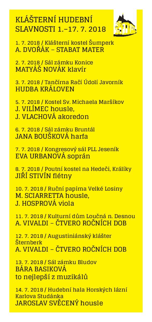 Od 1. do 17. července 2018 se v čtrnácti městech a obcích převážně Olomouckého, ale také Pardubického a Moravskoslezského kraje uskuteční celkem šestnáct koncertů. Záštitu nad festivalem převzal starosta Města Šumperka, senátor Mgr. Zdeněk Brož. Také letos přijala patronát nad festivalem Jana Boušková, jedna z nejlepších harfistek světa.