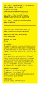 Koncerty v roce 2018 se již tradičně budou konat v Šumperku (klášterní kostel), Jeseníku (Kongresový sál PLL), Krnově (Koncertní síň sv. Ducha), Karlově Studánce (hudební hala HL), Bludově (zámek), Králíkách (klášterní kostel na Hedeči), Loučné nad Desnou (kulturní dům), Velkých Losinách (Ruční papírna) a také v Rapotíně (velký sál KKC).