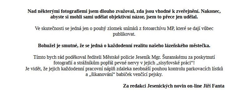 „Nevíme si kolikrát rady! Lidé nás často k těmto smutným případům volají, ale my toho moc nezmůžeme. Alespoň se pokaždé snažíme osobu identifikovat a pokud je z jesenického katastru, dopravíme ji na adresu trvalého bydliště, kde ji předáme rodinným příslušníkům. Takové štěstí máme ovšem jen málokdy. Většinou pochází z jiné obce nebo je to takzvaný bezdomovec. (Viz například článek Na šikmé ploše z rubriky JN „hříšní lidé“ – pozn. red.) Pokud máme navíc podezření na zranění podnapilé osoby, tak voláme 155 . Ti ale nebývají dvakrát nadšeni, když vidí, v jakém stavu se dotyčný nachází (agresivní a znečištěný – pozn. red.). Taky je pochopitelné, že nemají po takovém transportu čas hodinu drhnout auto. A co kdyby v tu chvíli, co se „zdržují s obyčejným opilcem“, někomu šlo opravdu o život!? Pokud to jde, necháme člověka vystřízlivět tam, kde je, a po tu dobu ho jezdíme opakovaně kontrolovat,“ uvedl jeden z městských strážníků.