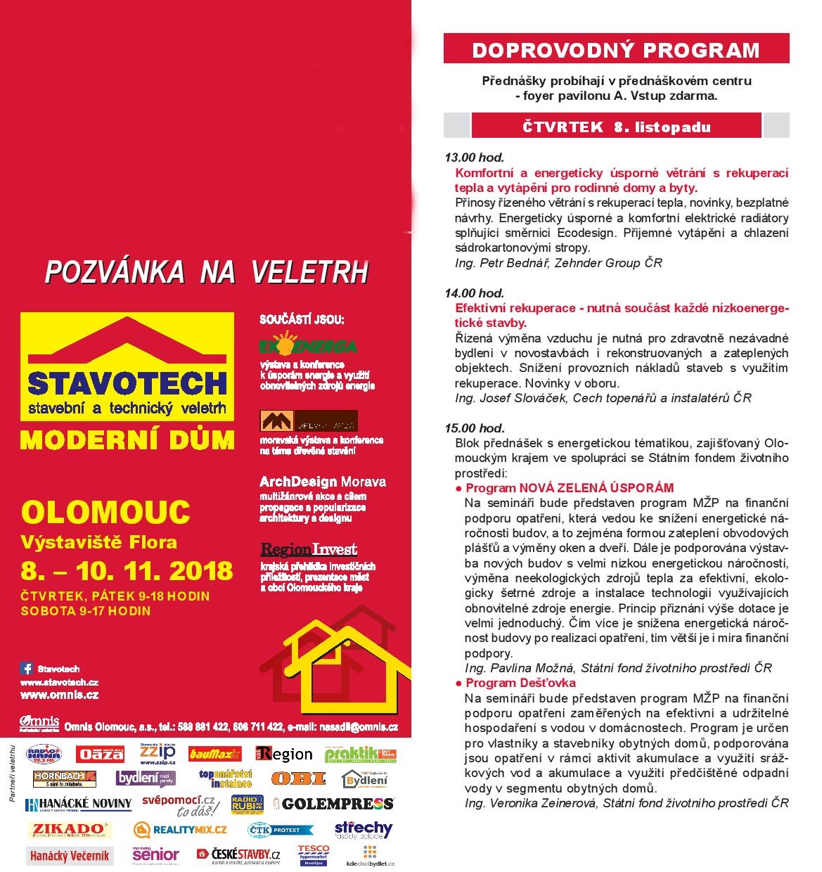 Stavební a technický veletrh STAVOTECH – Moderní dům Olomouc se za dobu svého trvání vypracoval v největší a nejzajímavější podzimní stavební veletrh na Moravě. 56. pokračování veletrhu se koná od čtvrtku 8. do soboty 10. listopadu 2018 v pavilonu A