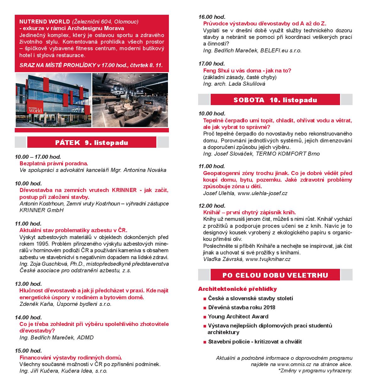 ArchDesign Morava je název osvětové multižánrové akce zaměřené na architekturu, design a stavebnictví. Její součástí budou opět přednášky, exkurze a panelové architektonické a designové výstavy. Architektonická procházka letos navštíví jedinečný komplex Nutrend World v místní části Chválkovice. Největším tahákem bude ale bezesporu architektonická přehlídka sto panelů výstavy s názvem České a slovenské stavby století, která mapuje úspěchy českého a slovenského stavitelství v průběhu sto let od vzniku naší republiky.
