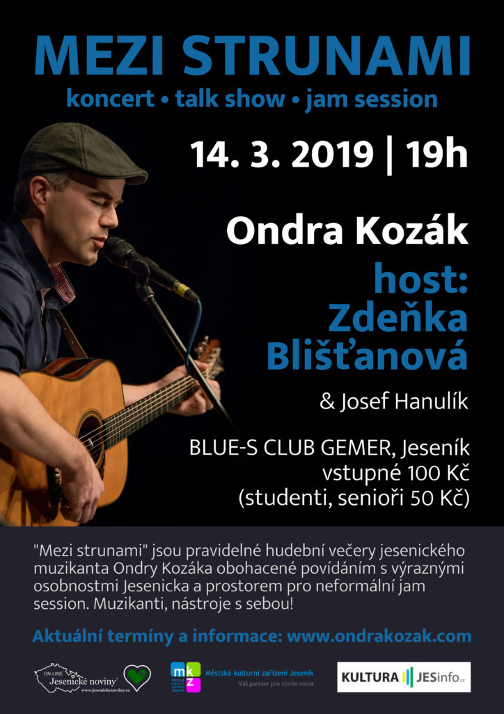 Jesenický muzikant Ondra Kozák organizuje 14.3.2019 druhý pořad s názvem „Mezi strunami“. Jeho hosty tentokrát bude starostka města Jeseník Zdeňka Blišťanová (talk show) a místní jazzový kytarista Josef Hanulík. Na závěr bude dán prostor všem přítomným muzikantům zapojit se do neformálního jam sessionu. Muzikanti, nástroje s sebou!