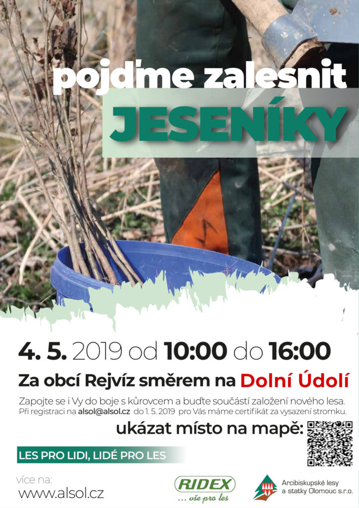 Rejvíz: ,,Pojďme zalesnit Jeseníky“, lákají lesníci ze společnosti Arcibiskupské lesy a statky Olomouc s.r.o. na akci pro širokou veřejnost, která se uskuteční 4. května na mýtině poblíž obce Rejvíz směrem na Dolní Údolí. Návštěvníci si společně s lesníky budou moci vysadit mladé sazenice dřevin a zároveň se dozví informace o základních pravidlech výsadby i aktuální informace o lesích v Jeseníkách. Partner akce, společnost Ridex, zase připravuje pro děti zábavné hry a kvízy.