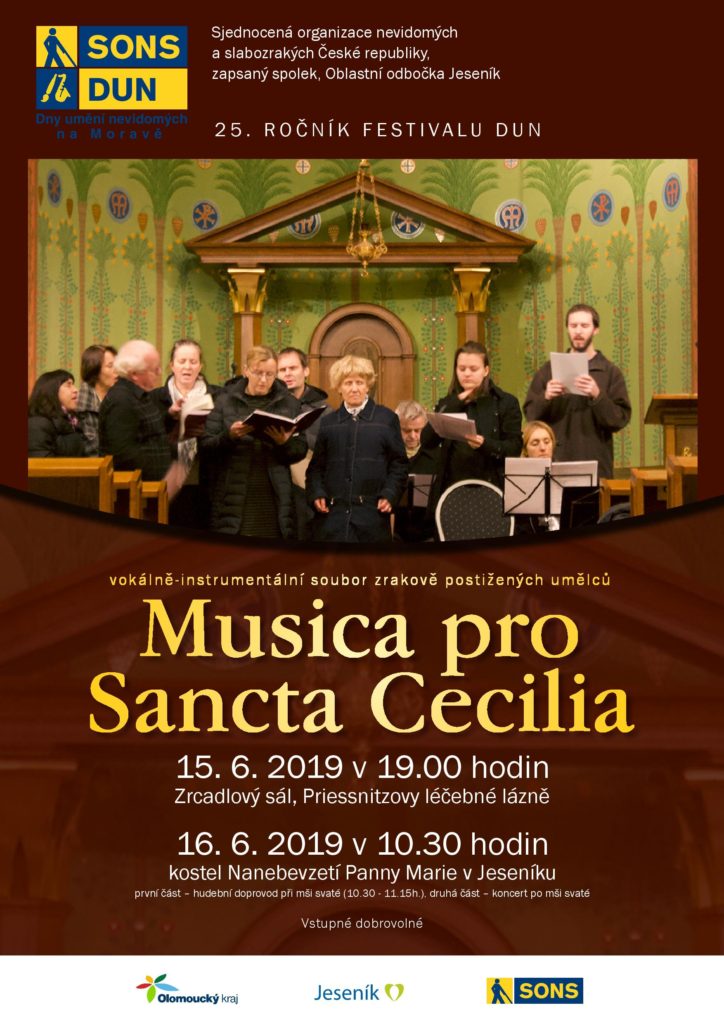 Dvakrát během jednoho víkendu budete mít možnost zaposlouchat se do krásné hudby vokálně-instrumentálního souboru zrakově postižených umělců Musica pro Sancta Cecilia, který se zaměřuje především na interpretaci hudby z období gotiky, renesance a baroka. Soubor vznikl v roce 1992 na půdě pražské Konzervatoře a ladičské školy Jana Deyla (konzervatoř pro zrakově postižené), dnes v souboru působí 7 absolventů této konzervatoře. Pod současným názvem, který byl vybrán podle patronky hudebníků Svaté Cecílie, Musica pro Sancta Cecilia, soubor vystupuje od roku 1994. Všichni členové se práci v souboru věnují ve svém volném čase, většina z nich vyučuje na hudebních školách v Praze a jejím blízkém okolí.