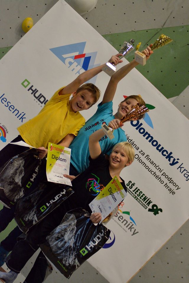 A co ve finále? Všechny cesty byly postaveny v tom největším převisu, který jesenická stěna může nabídnout o výšce přes deset metrů. Stavěči mladé lezce rozhodně nešetřili. Ve stěně se střídaly oblé chyty s lištami a silové kroky se měnily v technické pasáže a zpět. Výsledné pořadí na bedně potom vypadalo takto: