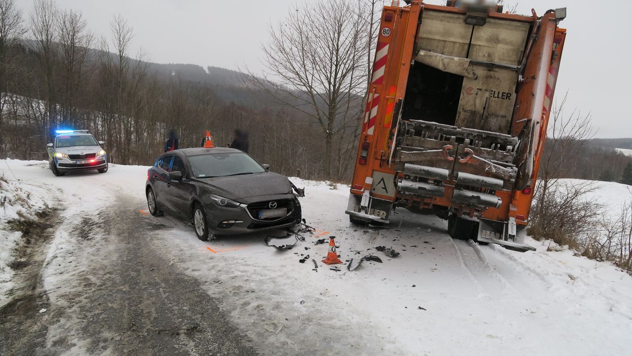 Ke střetu dvou vozidel v přibližně stejnou dobu došlo také nedaleko obce Travná na Javornicku. Devětašedesátiletý cizinec jel od obce Travná směrem k hranicím s Polskou republikou. V důsledku nepřiměřené rychlosti po průjezdu pravotočivou zatáčkou nezvládl řízení a narazil do protijedoucího nákladního vozidla zajišťujícího svoz odpadu. Při nehodě nebyl nikdo zraněn. Dechové zkoušky na alkohol měly u obou řidičů negativní výsledek. Celková škoda byla předběžně odhadnutá na 130 tisíc korun. Nehodu policisté vyřešili na místě uložením pokuty v příkazním řízení.