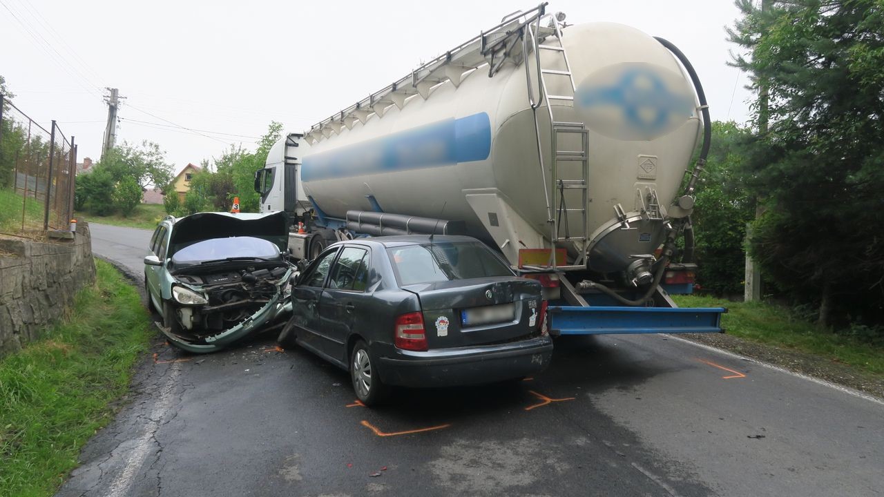 K nehodě tří vozidel, jednoho nákladního a dvou osobních, vyjížděli ve středu 30. června kolem poledne jeseničtí dopravní policisté. K nehodě došlo v Žulové na ulici Hlavní nedaleko obvodního oddělení Policie ČR. Čtyřiačtyřicetiletá řidička s vozidlem Škoda Fabia projížděla obcí ve směru od Vlčic na Vápennou. V důsledku nepřiměřené rychlosti přejela v prudké pravotočivé zatáčce do protisměru, kde její vůz narazil do cisternového návěsu protijedoucí nákladní soupravy. Po nárazu byl její automobil odhozen zpět do svého jízdního pruhu, ovšem otočený o 180°. Chvíli poté do jejího auta čelně narazil osobní vůz Peugeot 307, jenž jel také od Vlčic. Osmatřicetiletý řidič peugeotu vjel do zatáčky také příliš rychle, takže nedokázal zastavit na vzdálenost, na kterou má rozhled, a zareagovat na situaci v silničním provozu, resp. nehodu. Případné ovlivnění alkoholem policisté u všech zúčastněných řidičů vyloučili dechovými zkouškami. Při nehodě byli tři lidé zraněni. Ve fabii řidička a její nezletilá dcera a v peugeotu řidič. Celková škoda byla předběžně odhadnutá na 200 tisíc korun, z toho 100 tisíc na návěsu a po 50 tisících na každém z osobních aut. Okolnosti nehody jsou předmětem dalšího šetření.