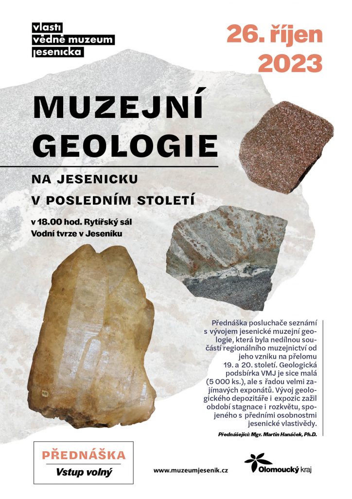 Přednáška posluchače seznámí s vývojem jesenické muzejní geologie, která byla nedílnou součástí regionálního muzejnictví od jeho vzniku na přelomu 19. a 20. století. Geologická podsbírka VMJ je sice malá (5 000 ks.), ale s řadou velmi zajímavých exponátů. Vývoj geologického depozitáře i expozic zažil období stagnace i rozkvětu, spojeného s předními osobnostmi jesenické vlastivědy.