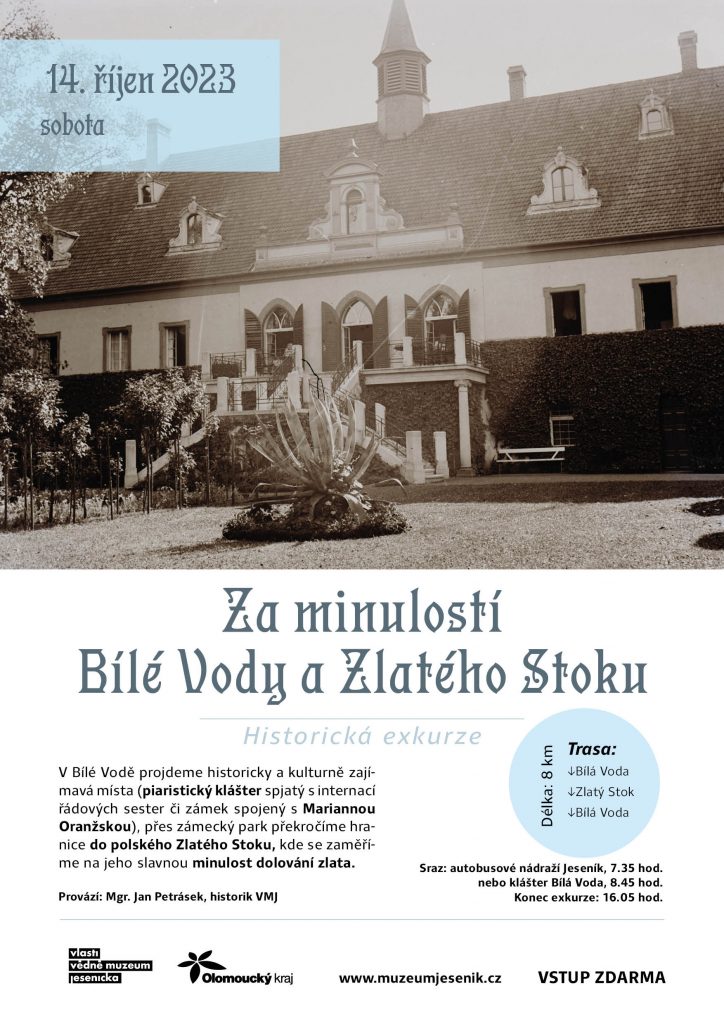Exkurze začíná odjezdem z autobusového nádraží v Jeseníku v 7.35, přistoupení po trase nebo 8.45 u kláštera v Bílé Vodě. Zde projdeme historicky a kulturně zajímavá místa (piaristický klášter spjatý s internací řádových sester či zámek spojený s Mariannou Oranžskou), přes zámecký park překročíme hranice do polského Zlatého Stoku, kde se zaměříme na jeho slavnou minulost dolování zlata.