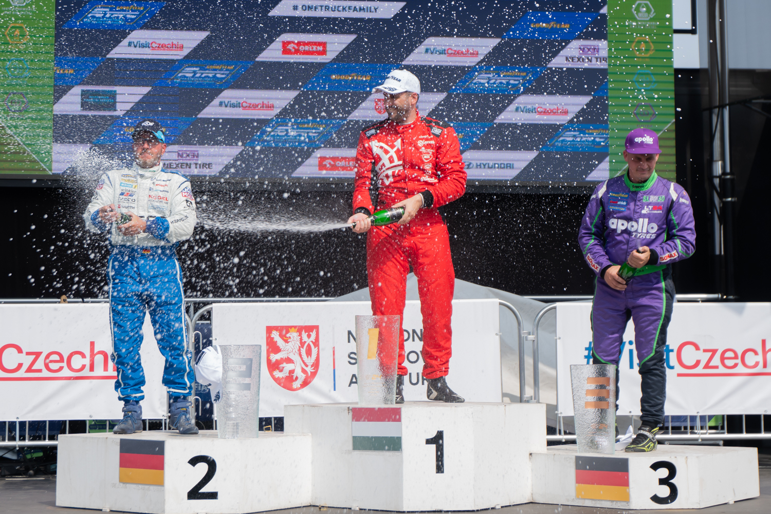 Stupně vítězů první jízdy trucků zleva Jochen Hahn Norbert Kiss Sascha Lenz.jp