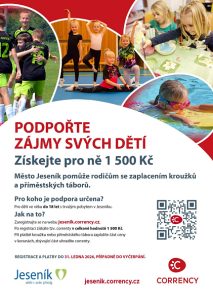 Elektronické correnty v hodnotě 1 500 Kč mohou použít na úhradu kroužků a volnočasových aktivit svých dětí. Registrace a platby je možné uskutečnit do 31. ledna 2026. Více informací o projektu a registrační formuláře pro občany i provozovatele mimoškolních aktivit naleznete na webu jesenik.corrency.cz