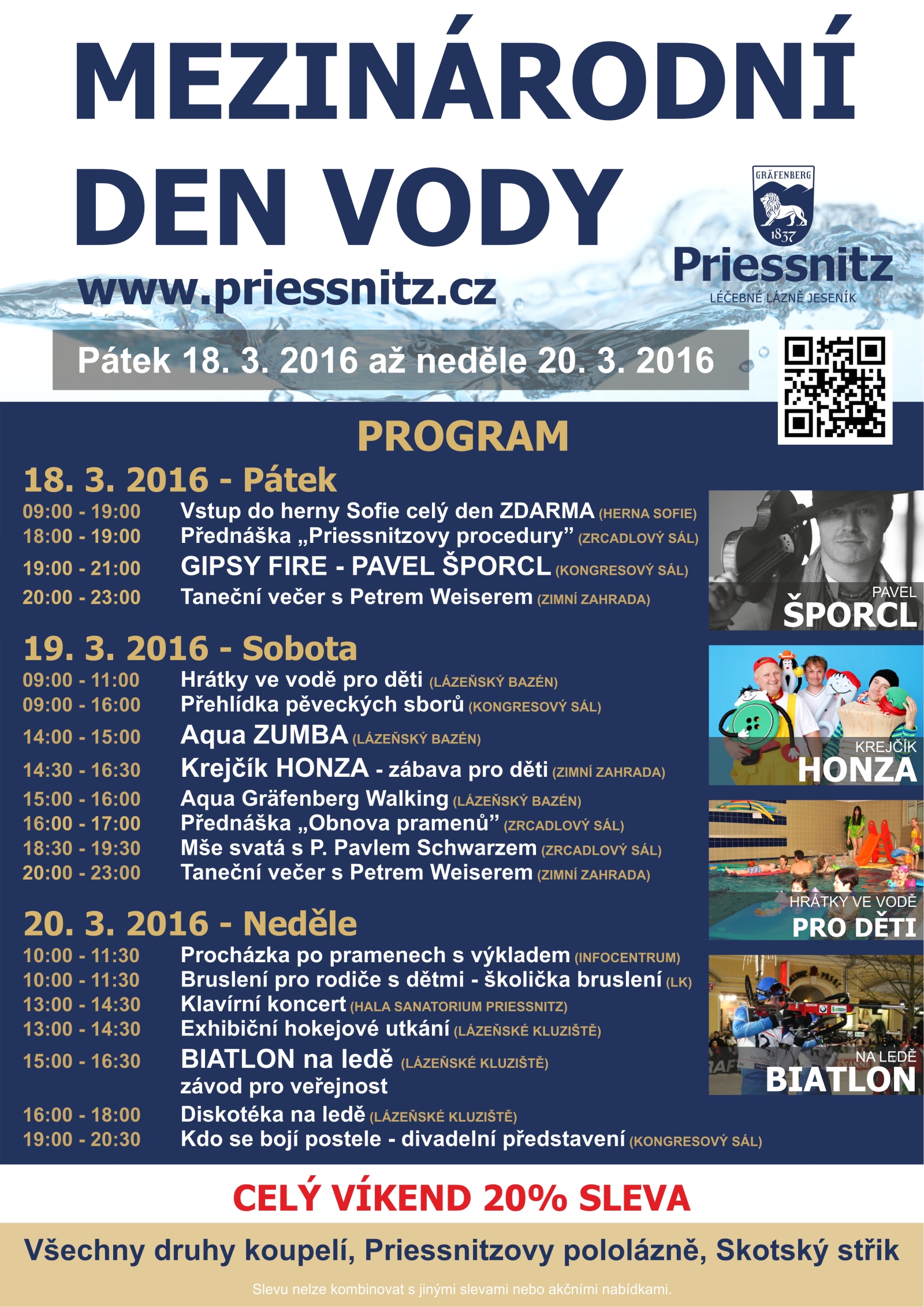 Od pátku 18. března do neděle 20. března se Priessnitzovy léčebné lázně opět připojí k připomenutí nezbytné role vody pro život. Na co se tedy můžete třetí březnový víkend v Jeseníku těšit? Slavnosti v pátek zahájí vskutku mimořádný koncert Pavla Šporcla s cikánskou cimbálovou kapelou GIPSY WAY ENSEMBLE. „Během celého prodlouženého víkendu si můžete poslechnout přednášky o tradičních Priessnitzových procedurách, o obnově pramenů na Studničním vrchu nebo se přímo zúčastněte komentované procházky po jeho svazích se znalcem jesenických pramenů Jiřím Glabazňou,“ zve do jesenických lázní jejich obchodní ředitel Tomáš Rak.